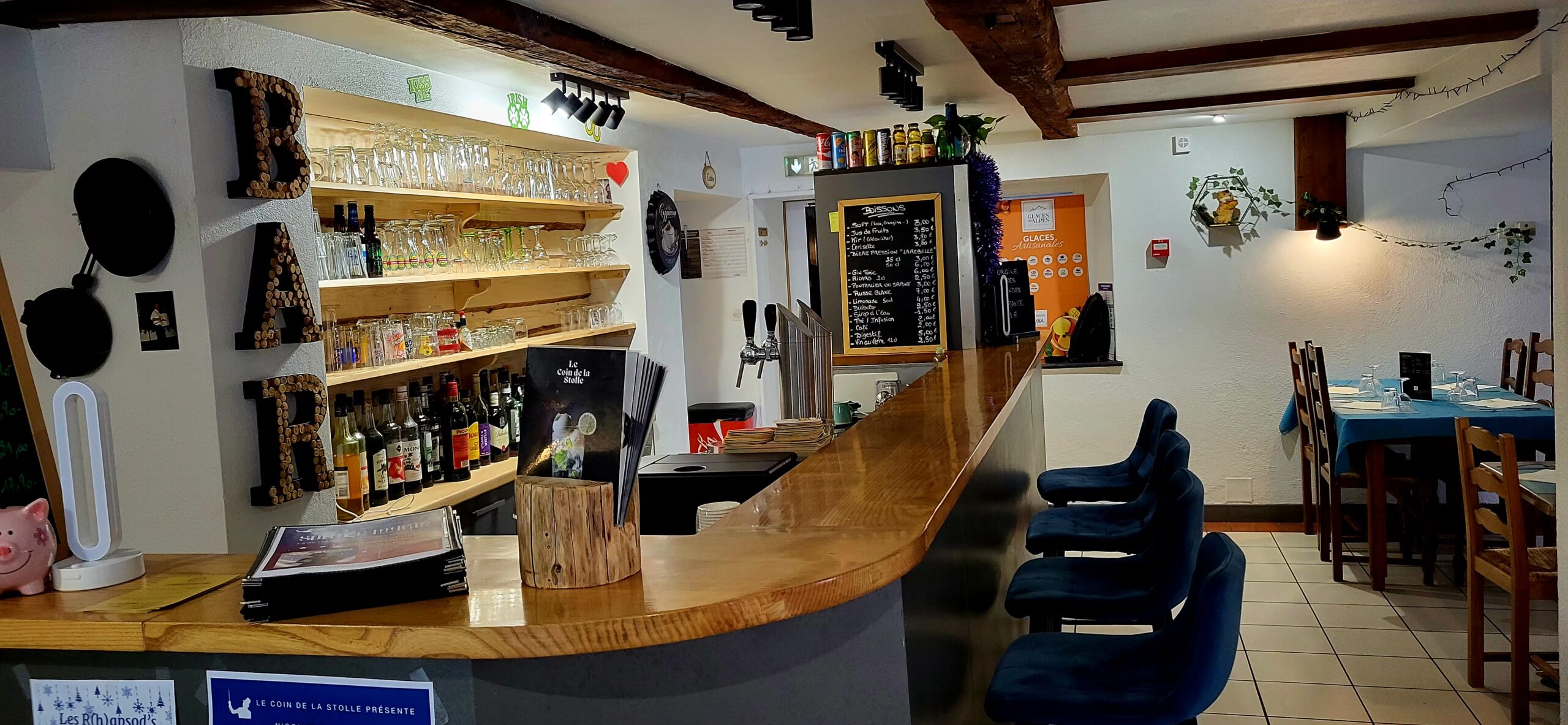Côté bar, venez profiter d’un moment de détente autour d’un verre, que ce soit pour un apéritif, une soirée animée ou simplement pour le plaisir de se retrouver.